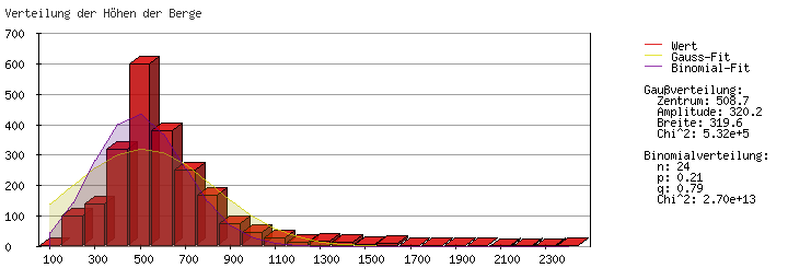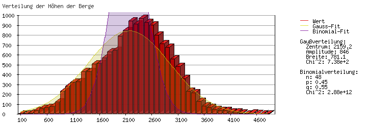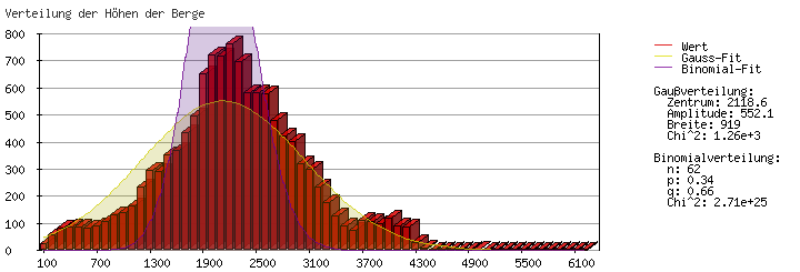 Die Berge weisen zunächst eine "buntere" Verteilung auf. Dies ändert sich jedoch, wenn man nur noch einzelne Gebirge betrachtet. So weisen sowohl die Alpen als auch die Mittelgebirge und insbesondere die Rocky-Mountains eine Gaussverteilung der Gipfel auf.