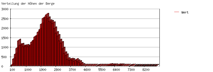 Hier finden Sie einige Zahlen über die Höhenverteilung der Hütten und Berggipfel. Die Höhen wurden dabei jeweils in 100m-Gruppen zusammengefasst, um hinreichend Daten zusammen zu bekommen, um statistisch relevante Aussagen treffen zu können. Die Grafiken wurden im Oktober 2007 aus den Daten des Projektes generiert.Hütten
