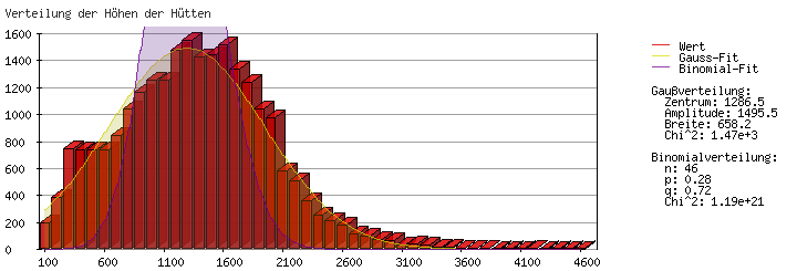 Überaschenderweise bilden die Höhen der Hütten eine recht gute Gaussverteilung mit Maximum zwischen 1300m und 1400m. Die halbe Halbwertsbreite (HWHM) beträgt etwa 800m. Grundlage für die Ausbildung einer Gaussverteilung dürfte die räumliche Zentriertheit der Hütten auf den Alpenraum sein.